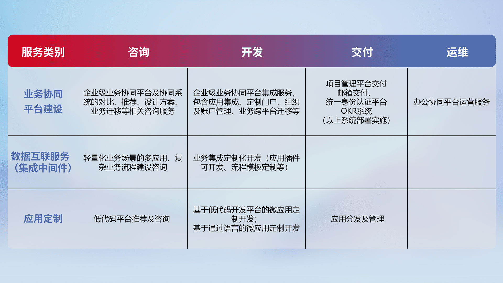 针对钉钉、、企微、、、、IDaas等平台级产品提供产品的规划、、方案、、、、交付、、、、定制化开发等服务,,,,实现如统一协同办公、、智能客户服务、、、混合会议管理、、智能数据查询、、等业务场景,,实现数字化转型。。